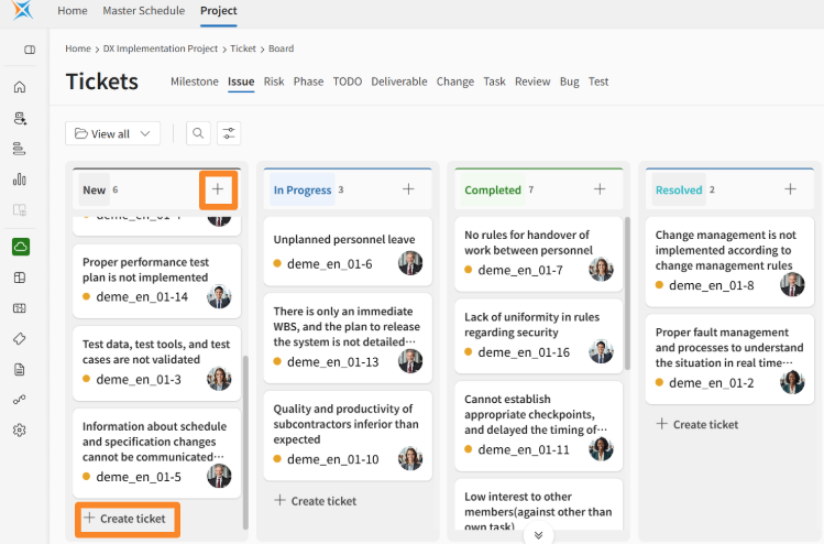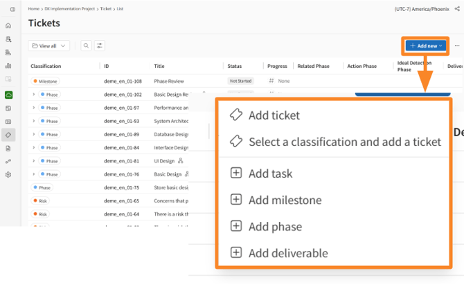 Select the appropriate item: [Add ticket], [Select a classification and add a ticket], [Add task], [Add milestone], [Add phase], or [Add deliverable].