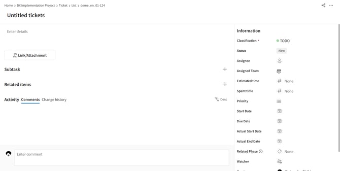 Click the newly created ticket and enter the required information into the fields on the displayed Details screen.