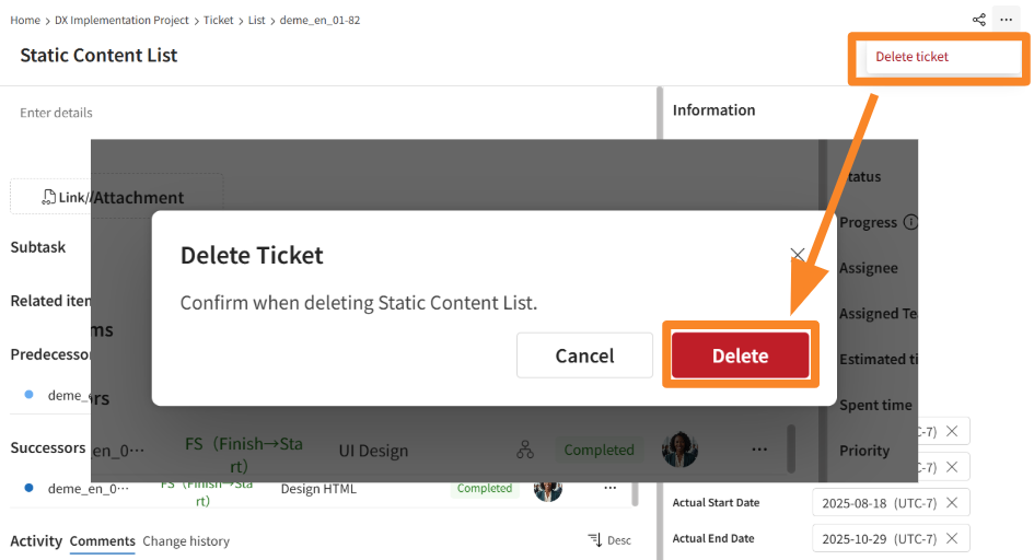 Click [Delete ticket] > [Delete].