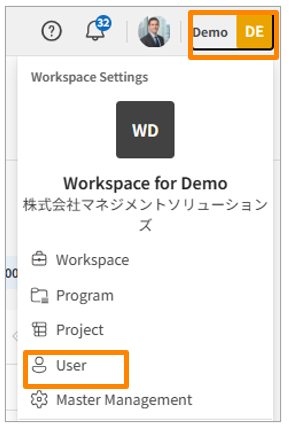 - Click your workspace name in the top-right corner of the screen, then click [User]. Alternatively, from the sidebar menu in the Workspace Settings screen, click [User].