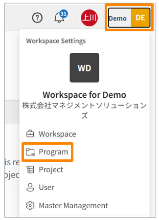 Click your workspace name in the top right corner of the screen, then click [Programs]. Alternatively, click [Programs] in the sidebar menu of the Workspace Settings screen.