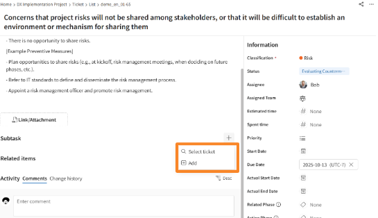 Add subtasks to each ticket to create a hierarchy of work. You can also link related tasks by adding associated items.