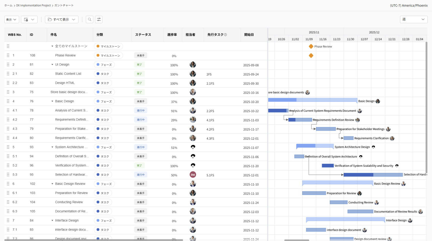 Tickets categorized as "Phases," "Deliverables," and "Tasks" are displayed with their start and end date bars. This view is useful for understanding progress against your plan and reviewing future work schedules.