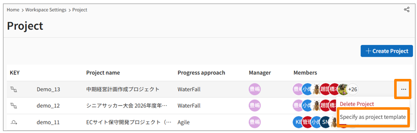 By saving an existing project as a Template, you can reuse it for future projects. This allows you to define optimized ticket classifications and dashboard settings as an "Organizational Standard," eliminating the need to set up every project from scratch.
