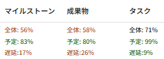 完了数(実績)÷完了数(予定) ※完了数(実績)は、ステータスカテゴリーが完了のチケット数 ※完了数(予定)は、期日が本日までのチケット数 |