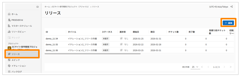 リリースを追加/編集する リリースを追加する サイドメニュー[リリース]をクリックします。 [追加]をクリックします。 表示されるチケット詳細画面から各入力フィールドを入力します。 リリースを編集する サイドメニュー[リリース]をクリックします。 編集したいリリースをクリックします。 表示される詳細画面で編集したいフィールドを更新します。