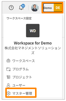 - 画面右上のワークスペース名をクリックし、[マスター管理]をクリックします。