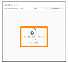 - 表示される[CSVからインポート]モーダルの[サンプルダウンロード]ボタンをクリックし、フォーマットをダウンロードしてください。