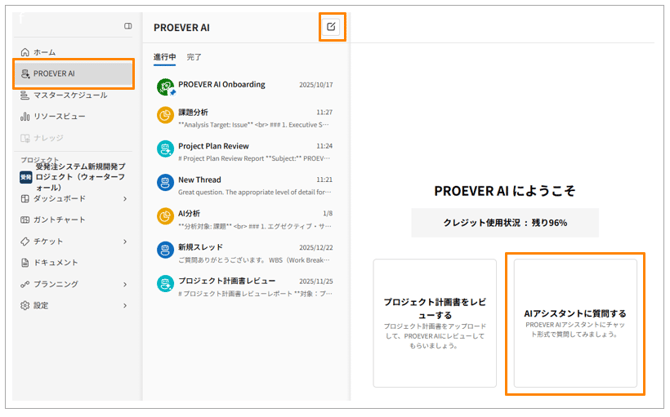 プロジェクトに関する不明点や疑問点、課題やリスクへの対処法をPROEVER AIと対話しながら解決できます。
