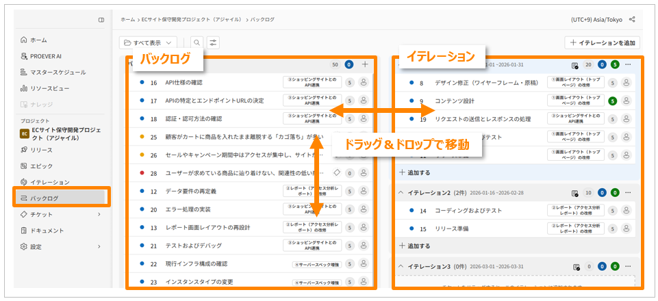 バックログでは 未完了タスクの優先順位付け、イテレーションでは対応計画の作成・調整 を行えます。ドラッグ&ドロップ操作を中心に、効率的にチケット整理や計画立案が可能です。