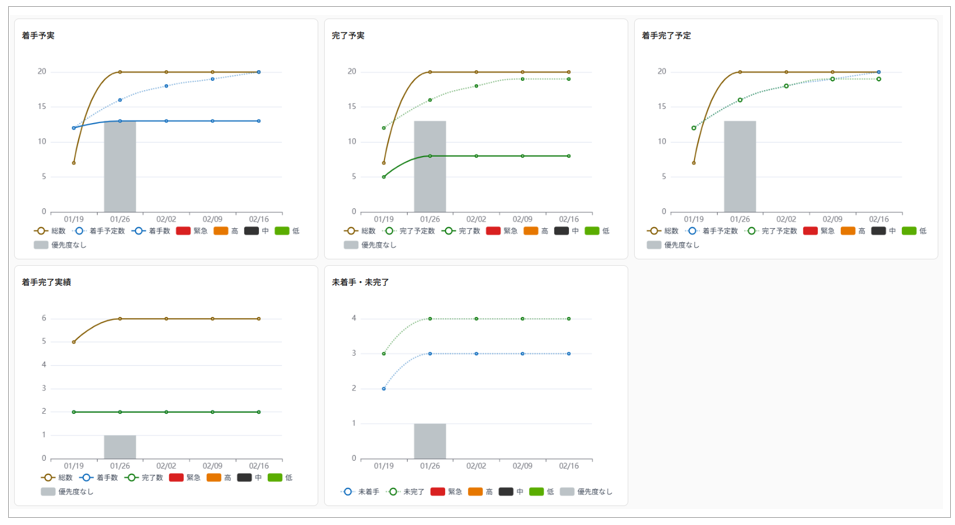 ダッシュボードやプロジェクトレポートに配置することで、プロジェクトの「今」を定量的に捉え、潜んでいる問題やリスクの早期発見をサポートします。