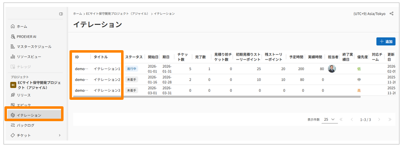イテレーションの進捗を確認する サイドメニュー[イテレーション]をクリックします。 確認したいイテレーションのIDをクリックします。 [対象チケット]欄から該当イテレーションに割り当てられたチケットの一覧を確認できます。また、[+]から追加で割り当てることもできます。