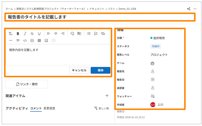 | 詳細 | 進捗報告の内容を入力します。チケット同様、リッチテキストで作成できます。画像の挿入も可能です。 |