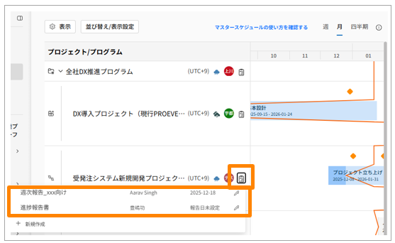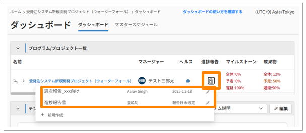 作成した進捗報告は、ドキュメント一覧画面から閲覧するほか、マスタースケジュールとダッシュボードからも閲覧できます。