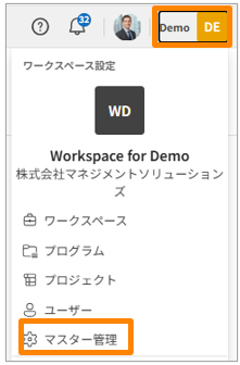 - 画面右上のワークスペース名をクリックし、[マスター管理]をクリックします。
