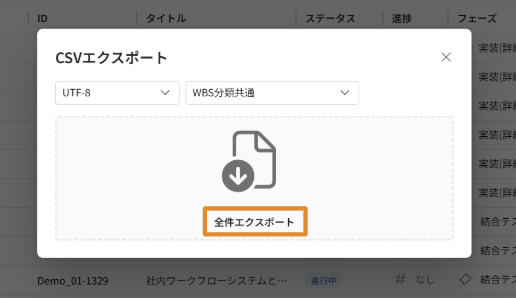 - 表示される[CSVエクスポート]モーダルの[全件エクスポート]ボタンをクリックします。