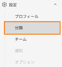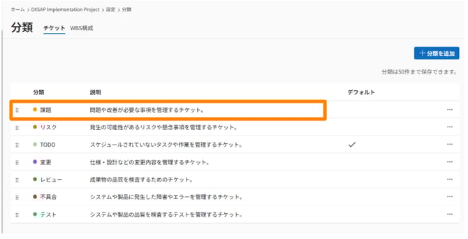 サイドメニュー[設定]>[分類]をクリックし、カスタマイズしたい分類を[チケット]、[WBS構成]タブの中から選択します。
