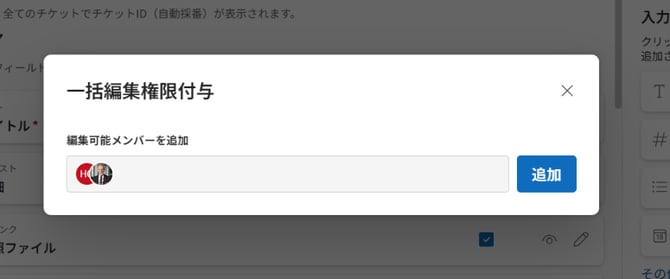 - 編集権限付与モーダルが表示されるので、[プロジェクトメンバー全員が編集可能] のスイッチを OFFにします。