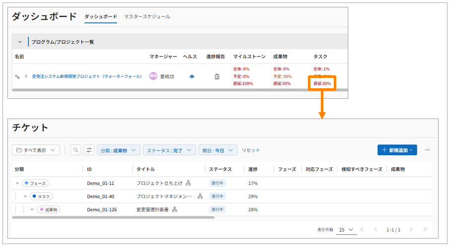 ダッシュボード画面のプロジェクトテーブルでは、登録されたチケットデータを集計し、全体進捗率/予定進捗率/遅延率といった指標を表示しています。