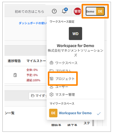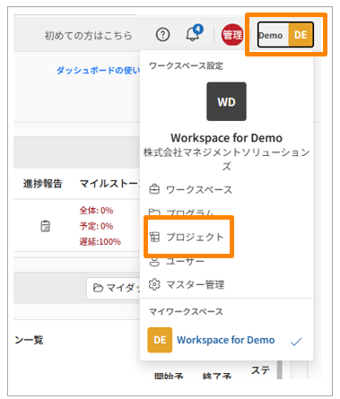 - 【PROEVER】画面右上のワークスペース名をクリックし表示されたメニューから[プロジェクト]を選択し、[プロジェクトを作成]をクリックします。