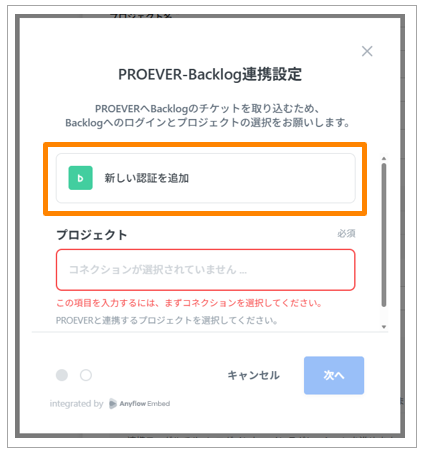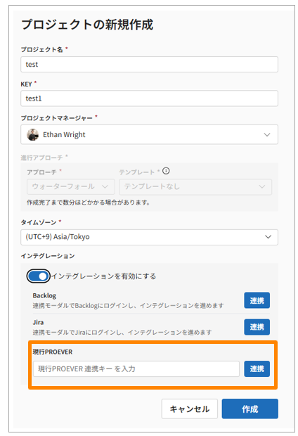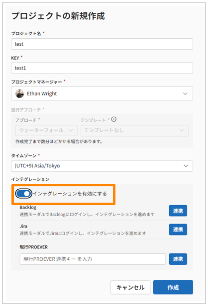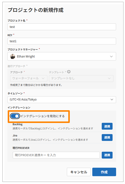 - 【PROEVER】プロジェクトの基本情報を入力し、[インテグレーションを有効にする]をクリックします。