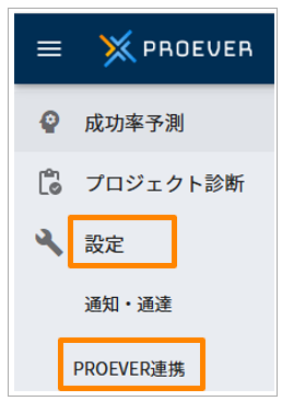 - 【PROEVER Classic】データ連携したいプロジェクトにアクセスし、[設定]>[PROEVER連携]をクリックします。