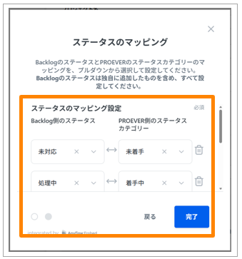 - 【PROEVER】ステータスのマッピングを行い、[完了]をクリックします。