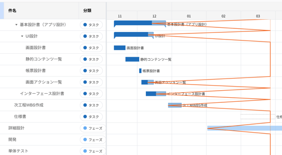 ガントチャートでは、階層ごとに表示を折りたたんだり展開したりできます。