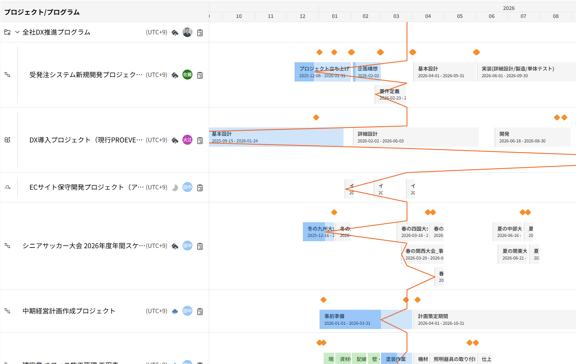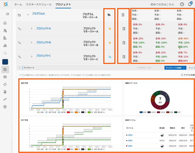プログラムダッシュボードは、複数のプロジェクトを横断して可視化し、「今、どこに注力すべきか」を明らかにします。