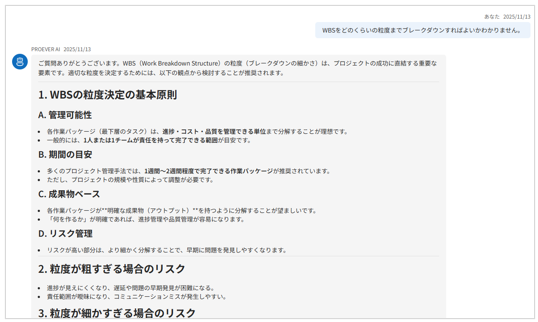 PROEVER AIは、MSOLの知見を有したAIアシスタントです。あなたと対話しながら、プロジェクトの状況把握や対処をサポートします。