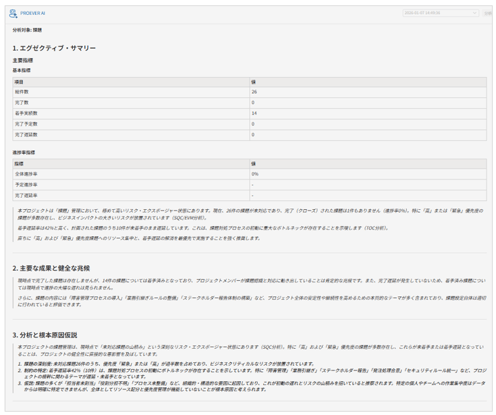 登録されたチケットデータをAIが客観的に分析し、定量情報と定性情報を踏まえた現状の分析結果やその原因、とるべき対策案を提供します。