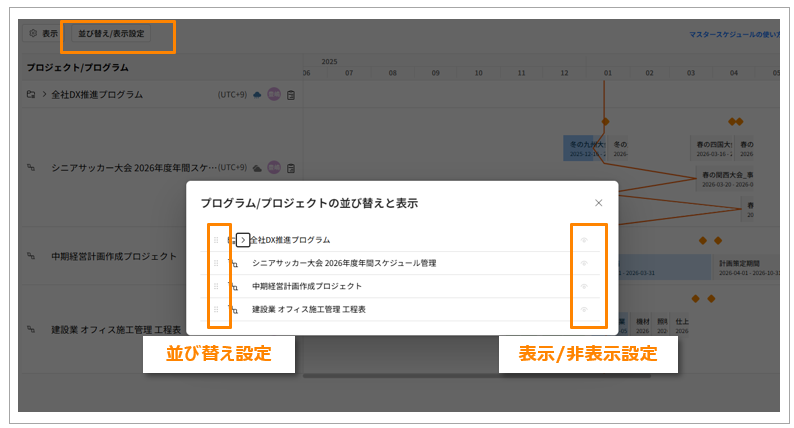 プログラム/プロジェクトのマスタースケジュールの表示/非表示や並び順を設定し、より重要なプログラム/プロジェクトにフォーカスして状況を把握できます。