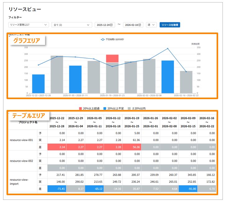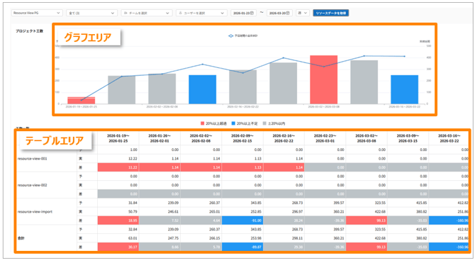 | 赤色 | 実績工数が予定工数より20%以上超過 (リソース不足・過負荷のリスク) |