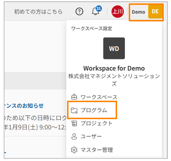 - 画面右上のワークスペース名をクリックし、[プログラム]をクリックします。