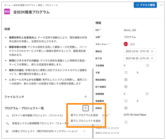 - 「プログラム・プロジェクト一覧」の右側[+]をクリックします。