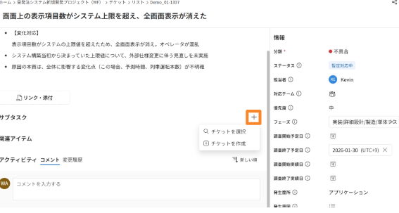- サブタスク/関連アイテムを設定したいチケットの詳細画面を開きます。
