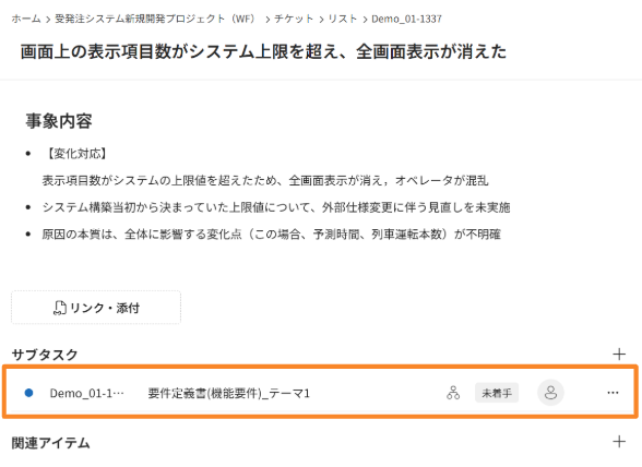 - サブタスク/関連アイテムの表示エリアにチケットが追加されたことを確認し、適宜各チケットを編集します。