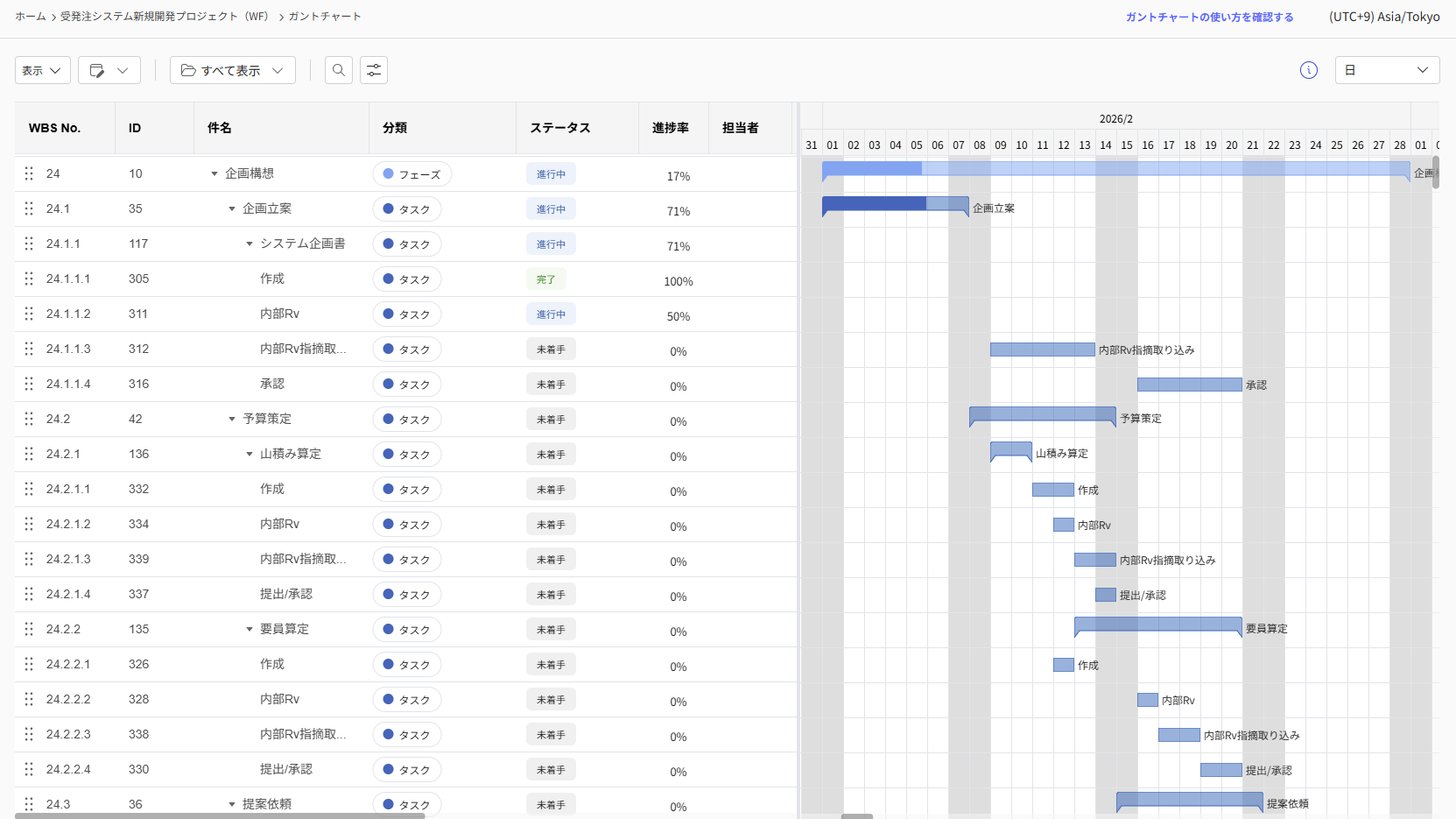 登録された「フェーズ」「成果物」「タスク」のチケットが、開始日/終了日のバーとともに表示されます。