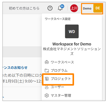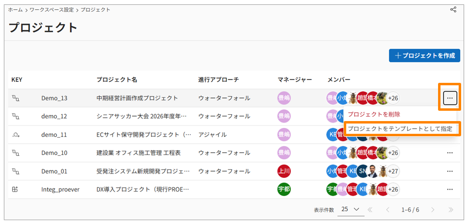 - 保存されたテンプレートは、ワークスペース設定のプロジェクト一覧で確認できます。